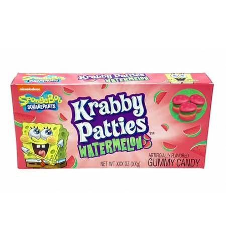 Krabby Patties Watermelon Theatre Box – fruchtige Kaubonbons mit intensivem Wassermelonen-Geschmack, inspiriert von der Kultserie Spongebob Squarepants. Jede 72-g-Packung bietet süßes, aromatisches Kauvergnügen, ideal für Impulskäufe und Süßwarenregale. VE = 12 Packungen.